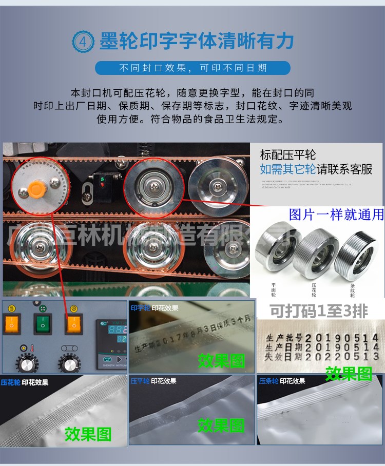 本机是新一代集印码,封口,连续输送为一体的自动薄膜封口机,具有印字清晰、顔色可选、即印即干、换字方便等特点。