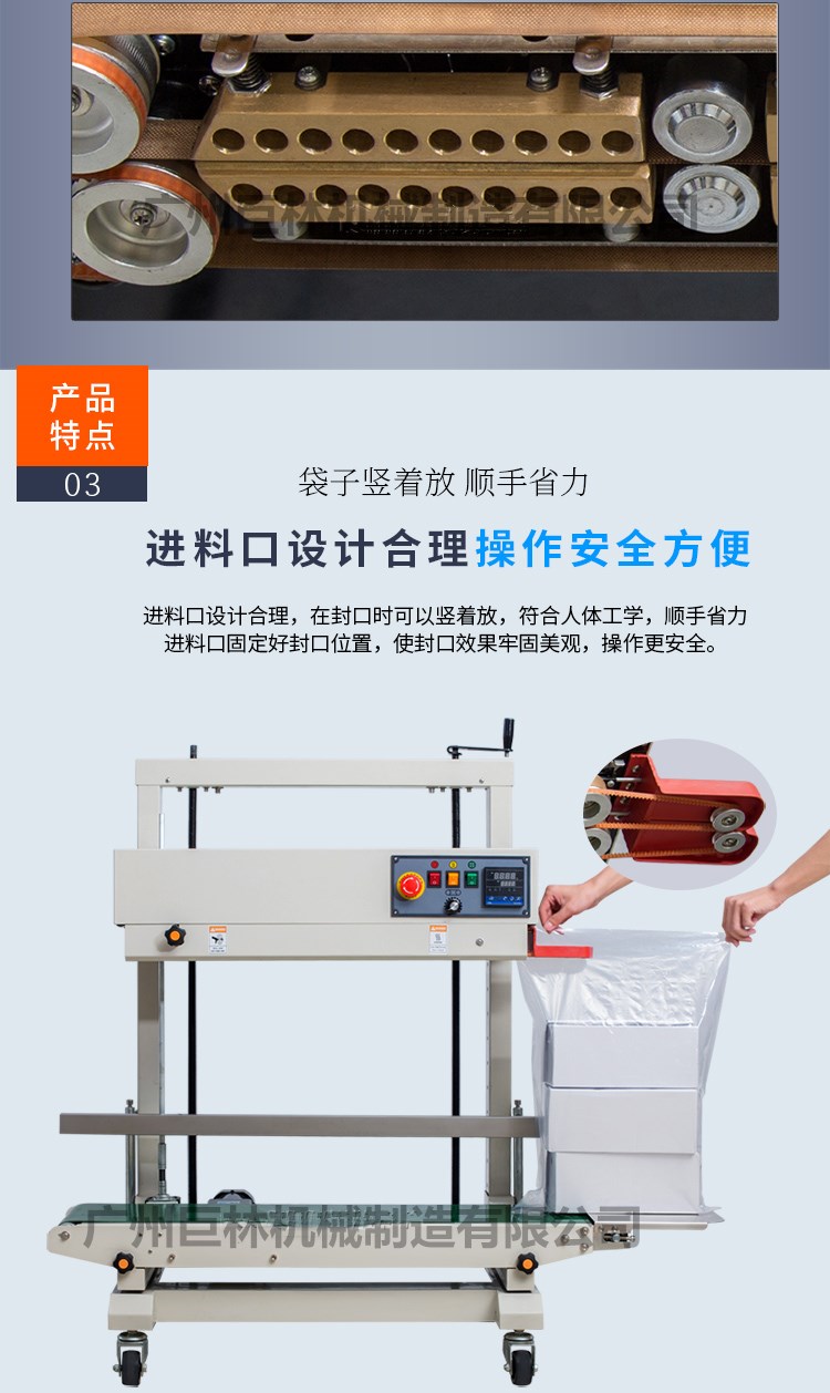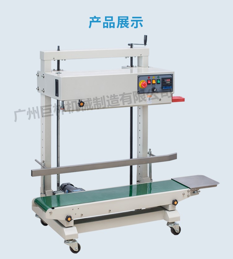 立式pe膜封口机采用立式封口,适合体型较大的物品包装,当包装物品的高度发生变化时,操作人员只需要简单摇动手柄即可使封口高度达到精准数值。
